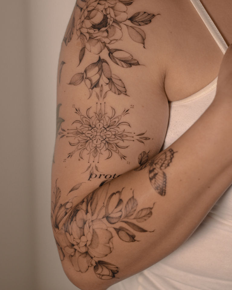 Me especializo en tatuajes de línea fina en negro y grises, inspirados en la naturaleza. Mi enfoque es capturar la elegancia y fluidez de las plantas, creando piezas que se integren armoniosamente con la anatomía de cada persona.